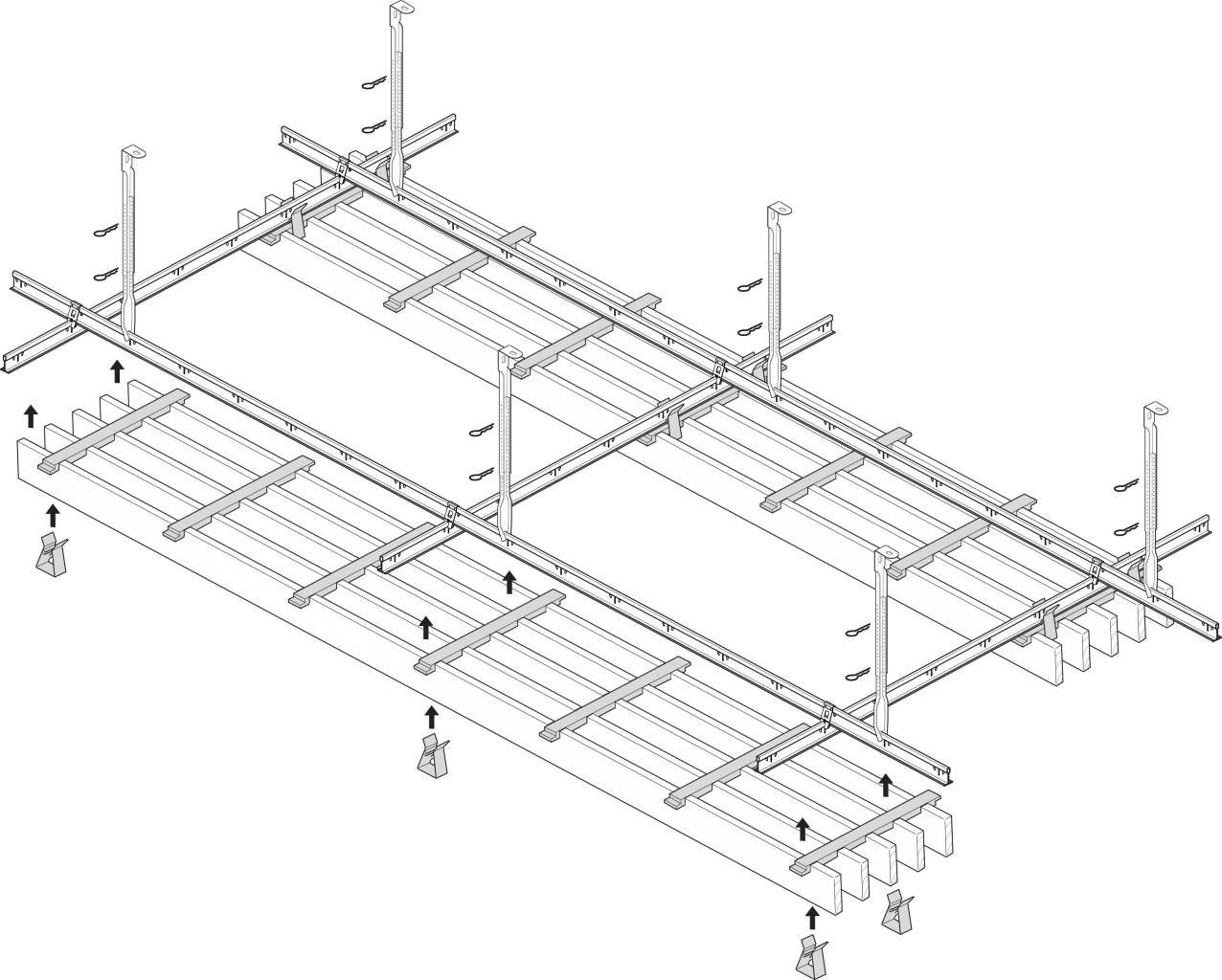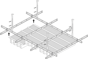 Grille® cassettes mounted on a system ceiling existing from black T-24 profiles in a partitioning of 600 x 600 mm or 1200 x 600 mm. The ready-made elements are mounted from below. Each element is individually removable.