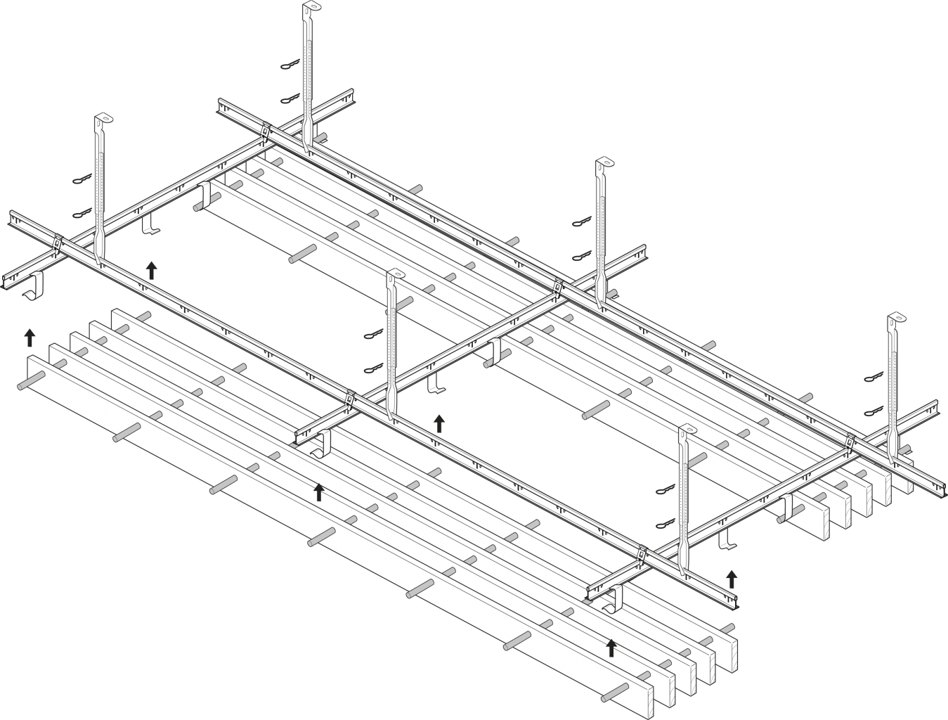 Grille ® dowel – Consists of slats connected by a 12 mm black aluminium rod. The element is clipped off with a metal clamp from below on a black T-24 profile. Suitable for ceilings where dismounting sporadically occurs.